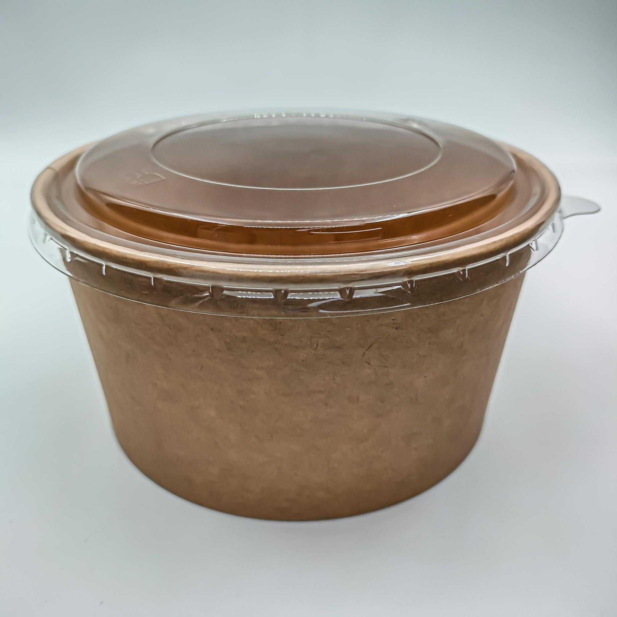 Контейнер бумажный крафт с пластиковой крышкой. Размеры контейнеры d - 128/150 мм, h - 77 мм, объем контейнера 1000 мл. Стильная бумажная крафт упаковка с пластиковой крышкой влагоустойчивая внутри для горячей или холодной пищи подходит для упаковки салатов и другой еды на вынос, для кондитерских изделий и полуфабрикатов.