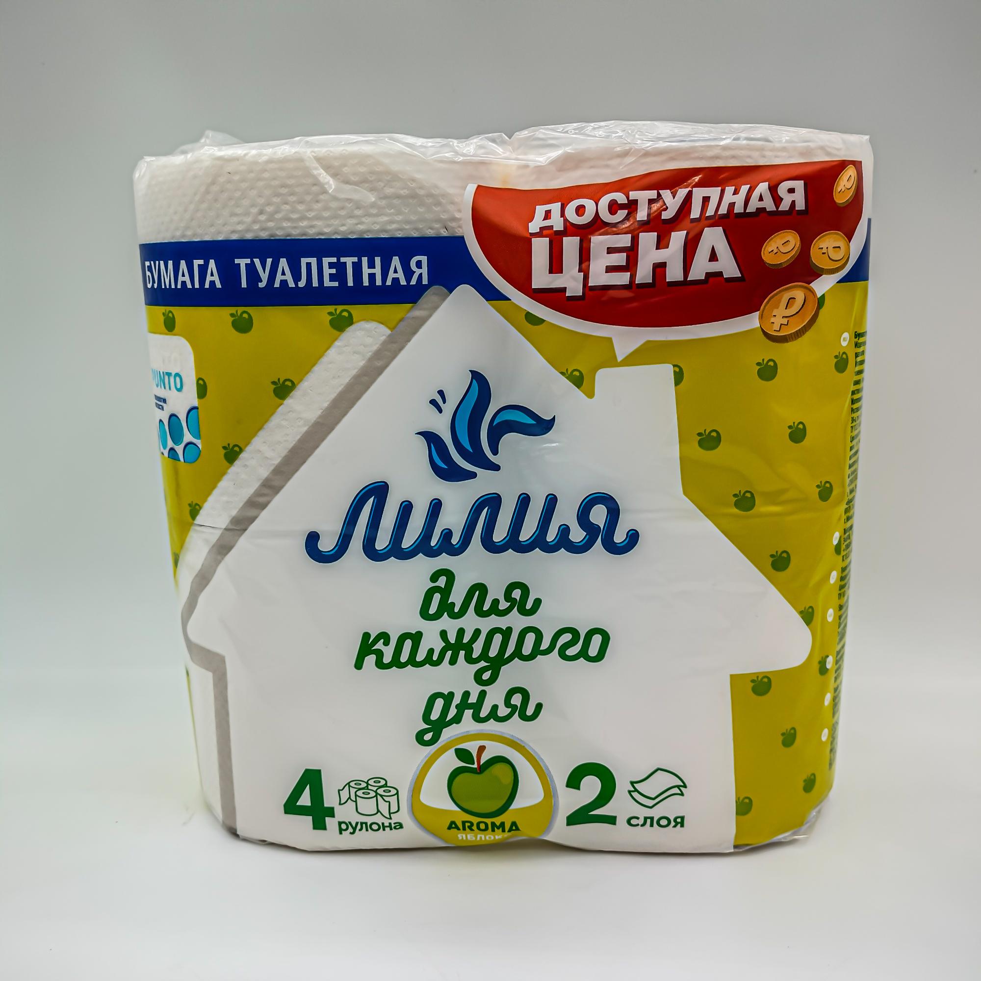 Туалетная бумага "Лилия" двухслойная с ароматом яблока, в упаковке 4 рулона. Бумага произведена из экологически чистого сырья, обладает отличной впитываемостью, прочностью, мягкостью, нежностью