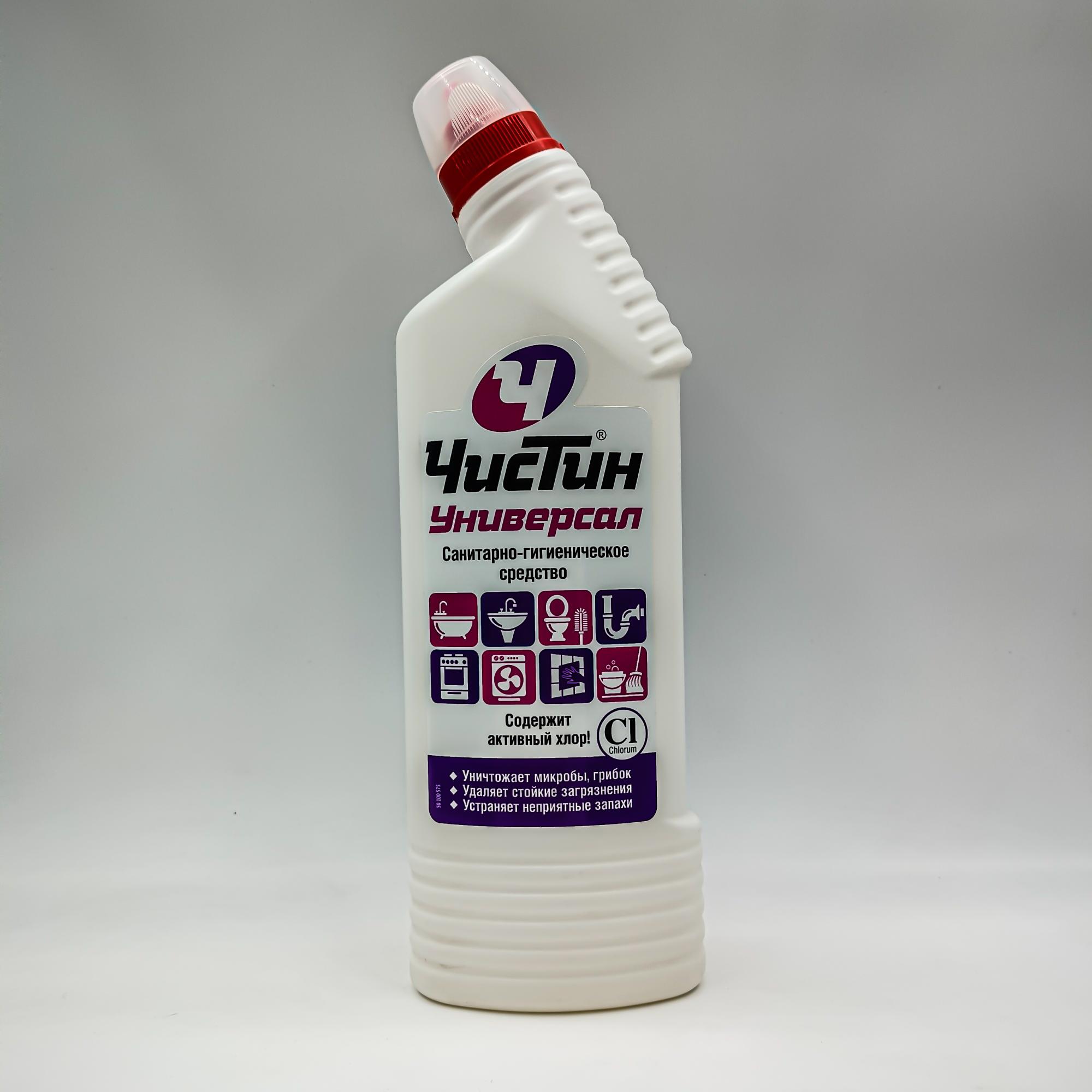 Санитарно-гигиеническое средство Чистин универсал с активным хлором 750 мл. Уничтожает микробы, грибок, неприятные запахи. Предназначено для чистки и антимикробной обработки раковин, ванн, душевных кабин, унитазов, профилактики засоров канализационных стоков, мытья керамической плитки, любых твердых моющихся напольных покрытий, настенных панелей, моющихся обоев, бытовой техники.