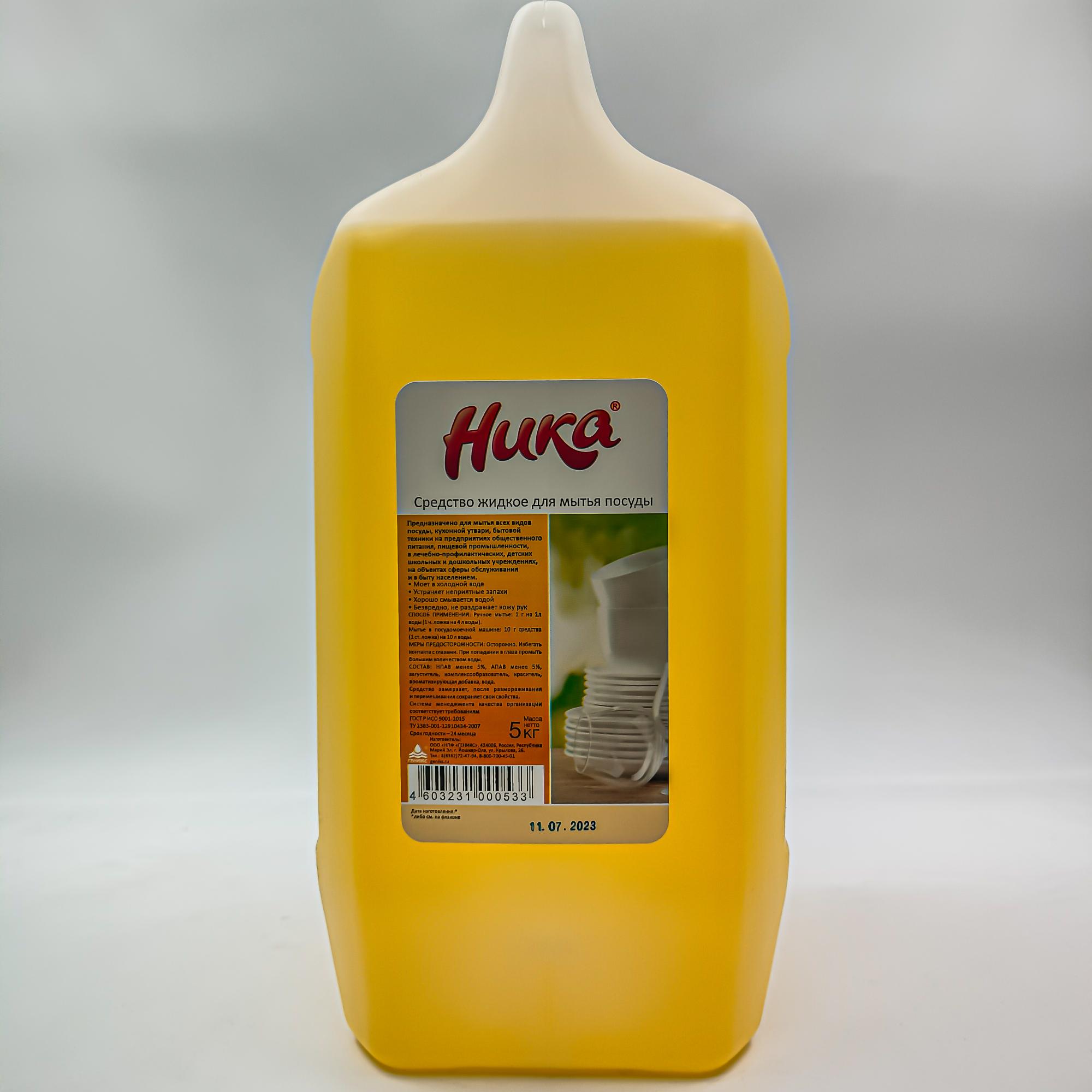 Средство для мытья посуды Ника 5 л. Применяется для всех видов посуды и предметов обихода, на предприятиях общественного питания, в коммунальных службах и в быту. Имеет прекрасные обезжиривающие свойства, удаляет с посуды все неприятные запахи, позволяет использовать средство в районах с повышенной жесткостью воды.