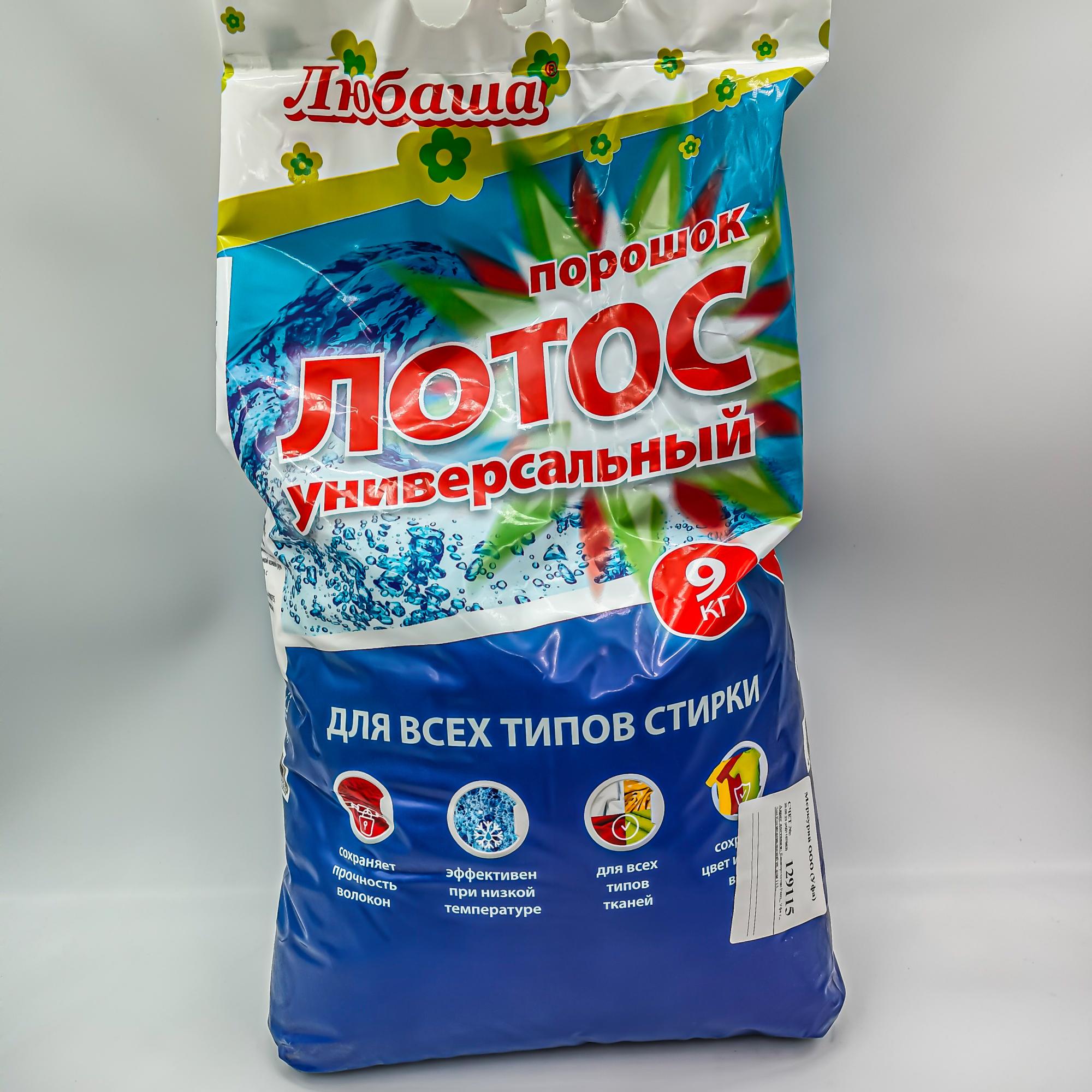 Стиральный порошок Любаша Лотос автомат 9 кг для всех типов тканей. Подходит для стирки в автоматических стиральных машинах, замачивания и стирки изделий из х/б, льняных и синтетических волокон.