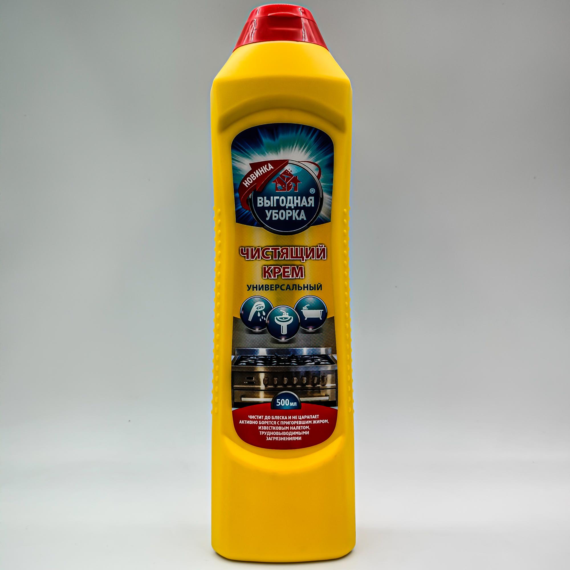 Универсальный чистящий крем Выгодная уборка 500 мл. Средство предназначено для удаления жирных пятен на кухне, налета и мыльных разводов в ванной. Придает блеск и сияние сантехнике.