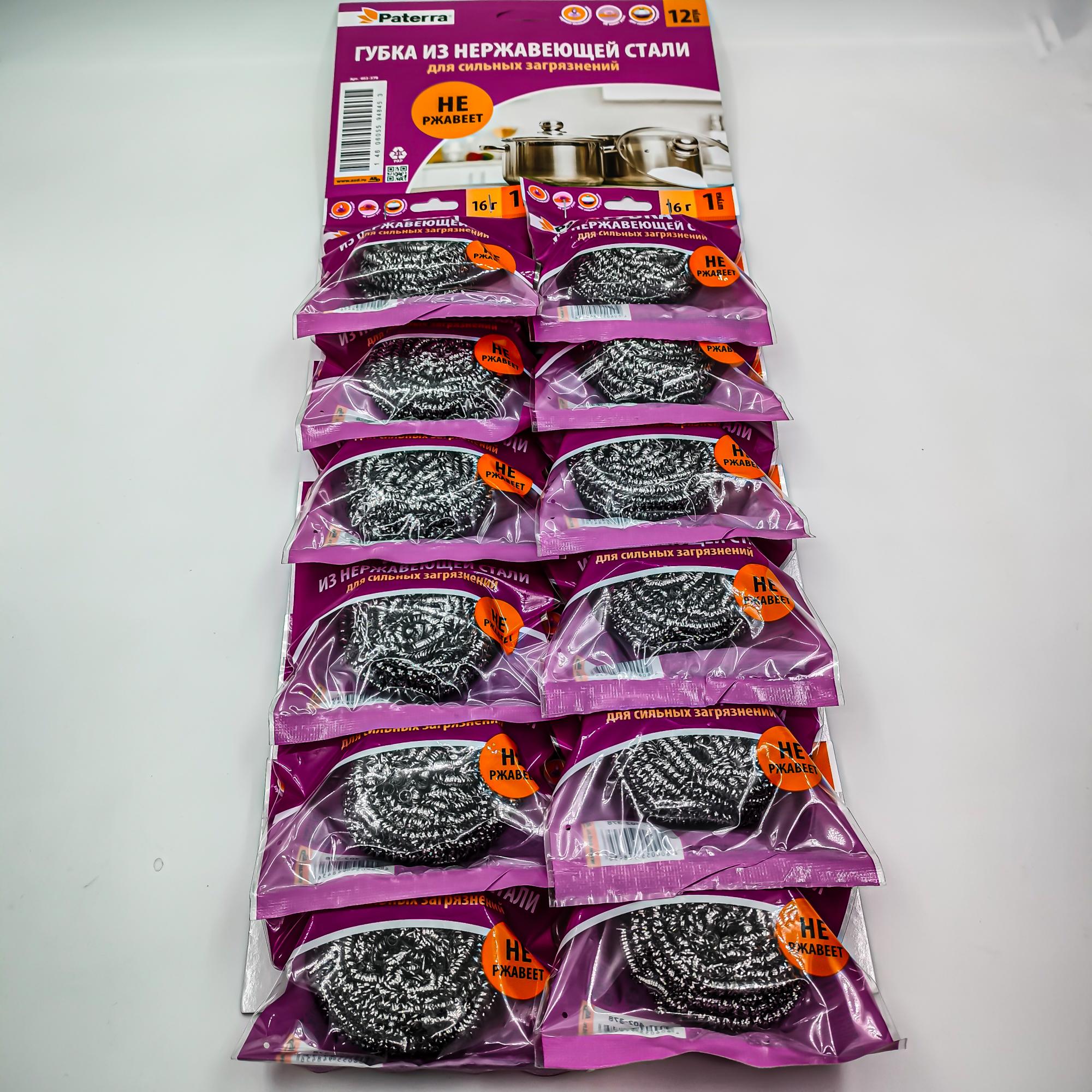 Губка металлическая "Paterra" по 12 штук на листе. Эффективный и прочный инструмент для удаления стойких загрязнений с посуды. Губка не церапает поверхность, легко справляется с жиром и нагаром. Губки продаются поштучно