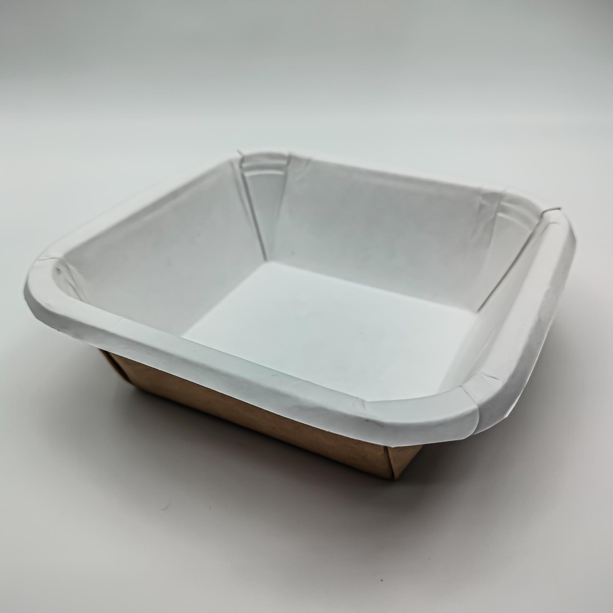 Контейнер бумажный крафт под запайку. Размеры коробки внутр. 135*135*40 мм, объем контейнера 350 мл. Стильная бумажная крафт упаковка с пластиковой крышкой влагоустойчивая внутри для горячей или холодной пищи подходит для упаковки салатов и другой еды на вынос, для кондитерских изделий и полуфабрикатов.