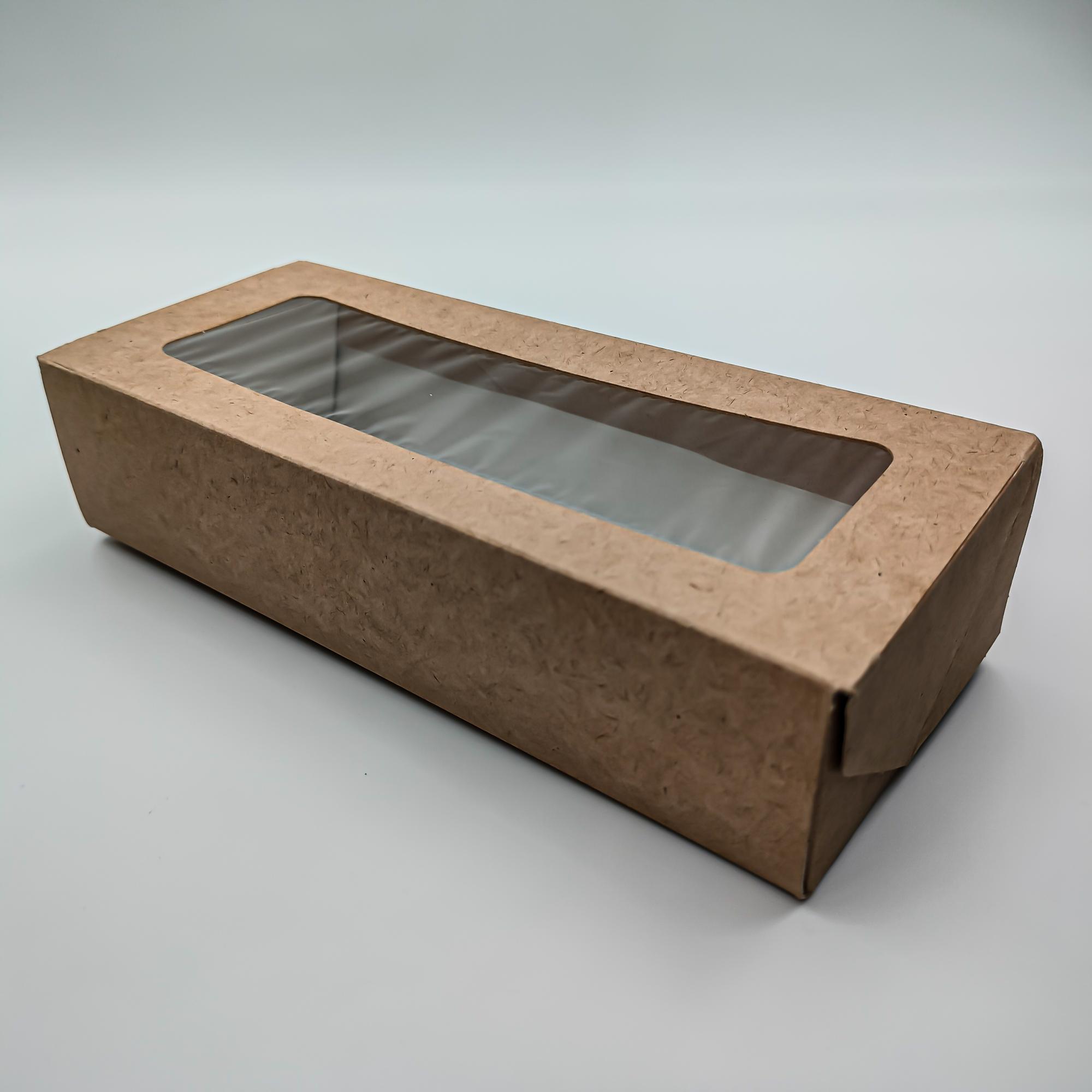 Контейнер бумажный сборный крафт с пластиковым окном. Размеры коробки 170*70*40 мм, объем контейнера 500 мл. Стильная бумажная крафт упаковка с картонной крышкой с окном влагоустойчивая внутри для горячей или холодной пищи подходит для упаковки салатов и другой еды на вынос, для кондитерских изделий и полуфабрикатов.
