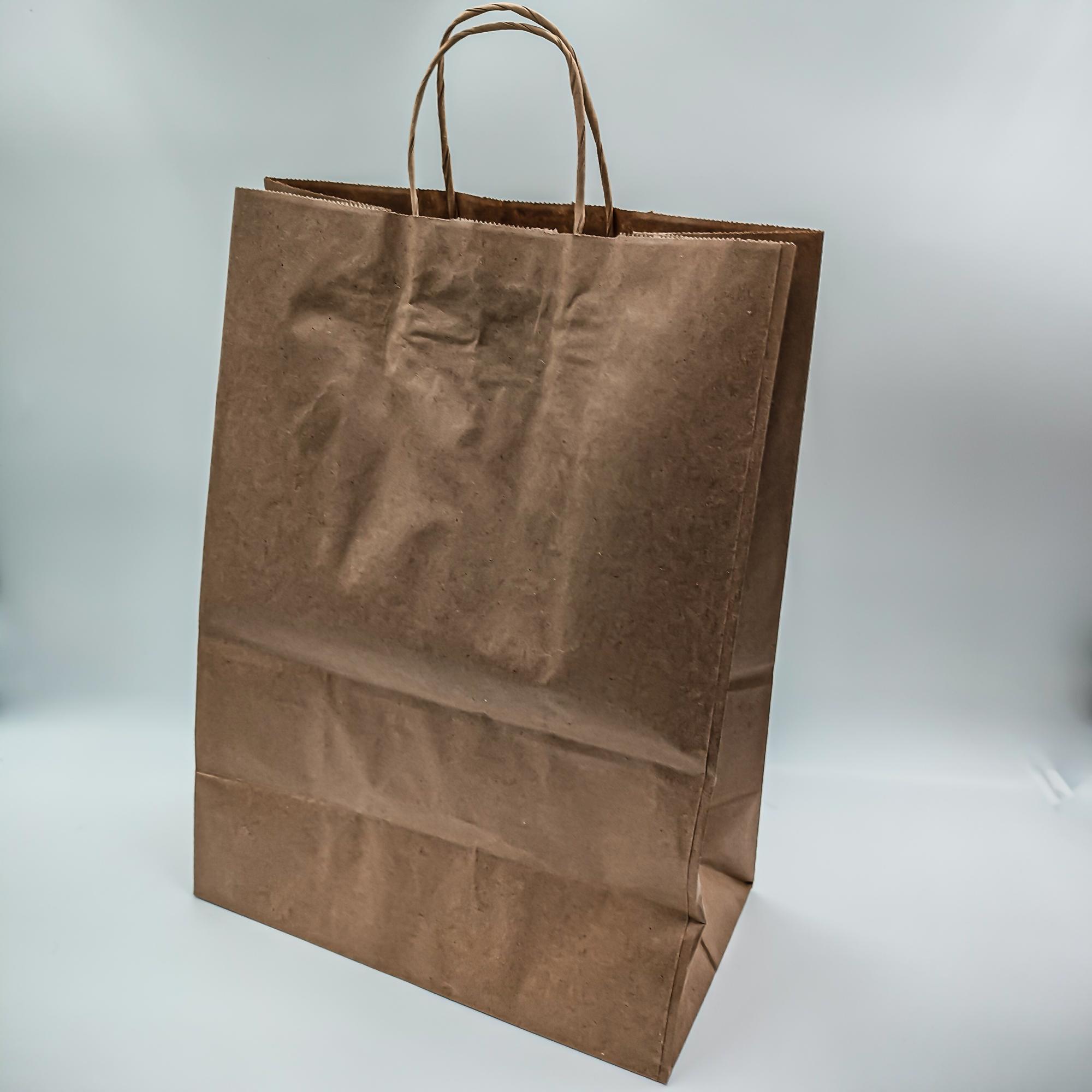Бумажные одноразовые крафт-пакеты с кручеными ручками (размеры 260*150*350мм) для упаковки пищевых и не пищевых продуктов. Данный вид фасовочных пакетов уже давно успешно используется для упаковки выпечки, хлеба, готовой продукции и подарков. Упаковка эстетически привлекательная и экологичная.