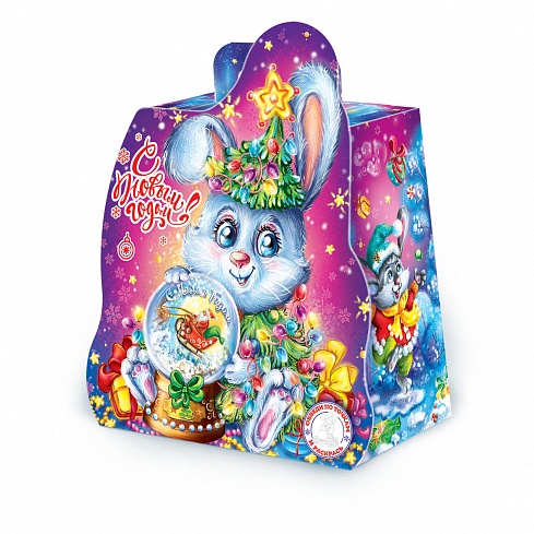 Коробка для новогоднего подарка "Заяц с подарком" на 800 г., размеры 160*100*180 мм. Яркая и красочная упаковка для подарка, поставляется в разобранном виде, собирается быстро и легко.