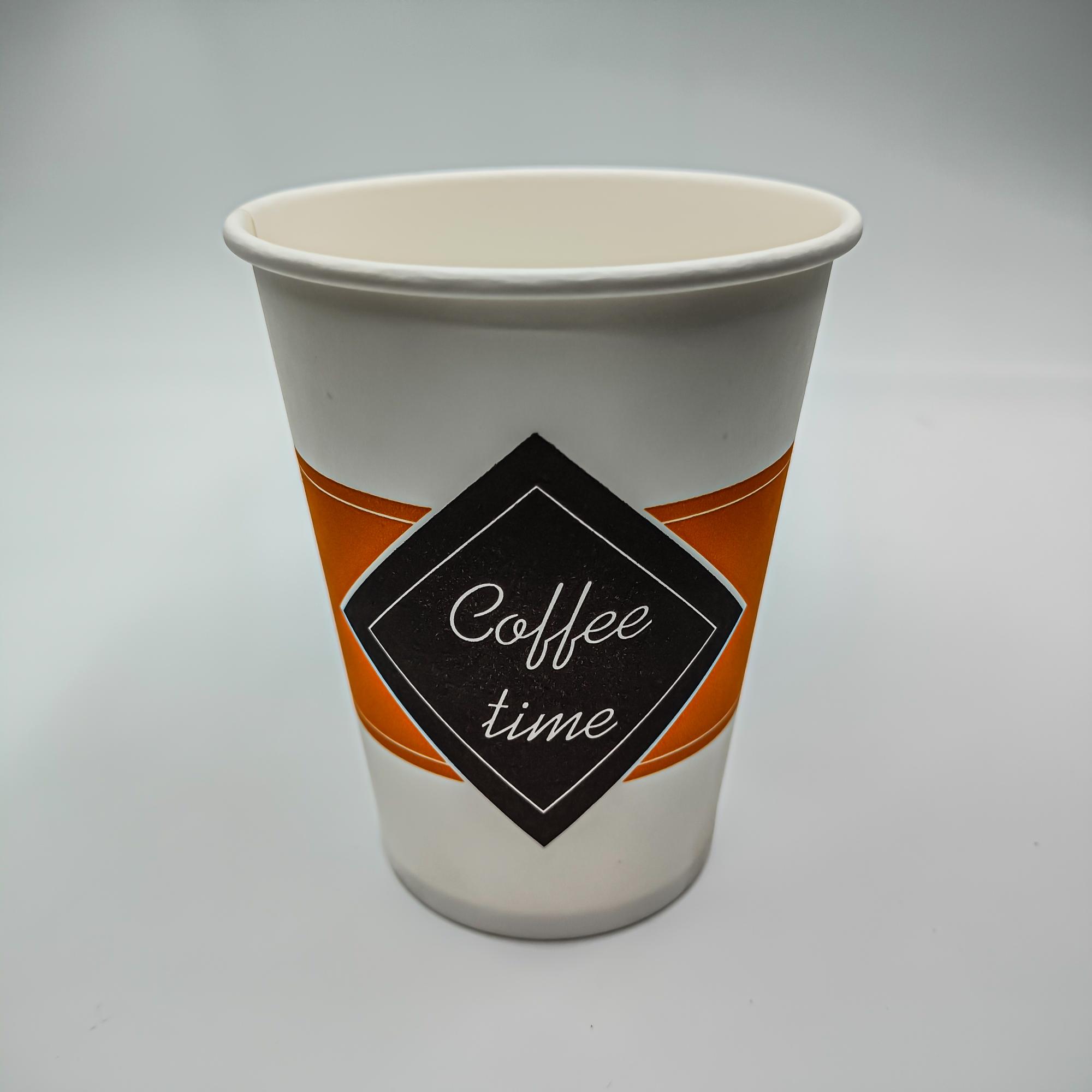 Бумажные стаканчики объемом 350 мл с рисунком "Кофе тайм" подходят для горячих и холодных напитков. Долго держат тепло и не нагреваются снаружи. Стакан не выскальзывает из рук. Бумажные стаканы экологичны, материал не влияет на вкус и аромат и эстетично выглядит. Для закрытия подойдут крышки диаметром 90 мм.