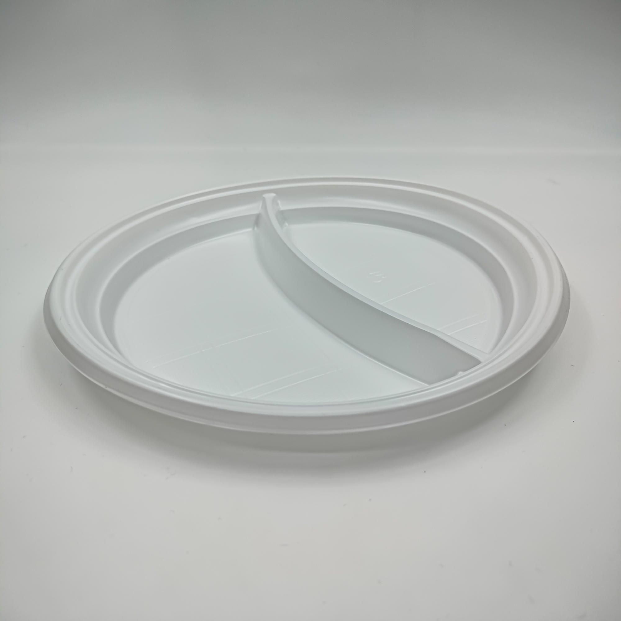 Тарелка белая диаметром 205 мм 2-х секционная. Тарелка подойдет для горячих и холодных продуктов, может использоваться в микроволновой печи. Материал тарелки безопасен для здоровья. Подойдет для предприятий общепита, мероприятий на природе, офисов. В упаковке 100 тарелок.