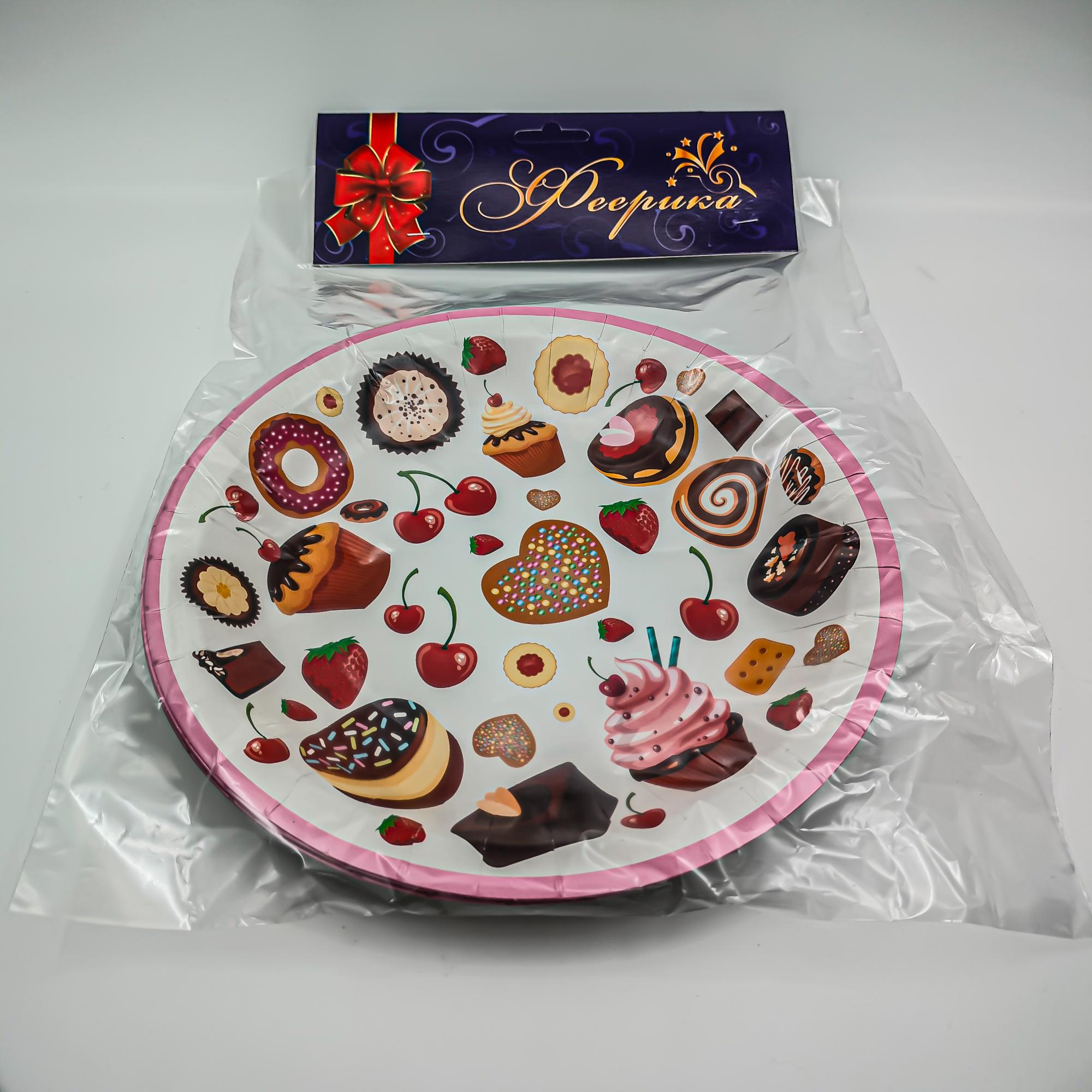 Одноразовые бумажные тарелки с рисунком "пирожные" круглые d 230 мм. Изготовлены из экологичного пищевого картона. Такая упаковка подойдет для горячих, холодных блюд Прекрасно подойдут для детского праздника или мероприятия на природе. В упаковке 6 штук.