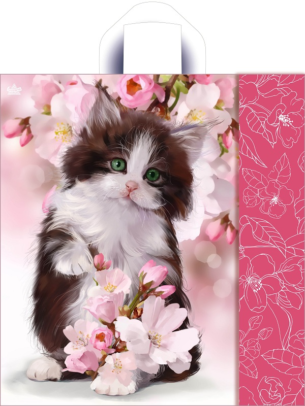 Пакет из ПВД "Котенок в цветах" с петлевой ручкой, размеры: 435*400*0,035. Красочные потребительские пакеты с готовым дизайном пользуются спросом в различных сетевых магазинах и розничных точках продаж. Их вы можете встретить, как в магазине у дома, так и в крупном торговом центре, а также в дорогом бутике по продаже элитной мужской или женской одежды. В одной упаковке 50 пакетов