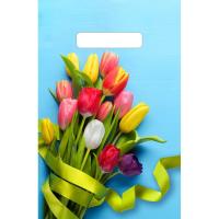 Пакет из ПВД "Тюльпаны на голубом" с вырубной ручкой, размеры: 300*200*0,03. Красочные потребительские пакеты с готовым дизайном пользуются спросом в различных сетевых магазинах и розничных точках продаж. Их вы можете встретить, как в магазине у дома, так и в крупном торговом центре, а также в дорогом бутике по продаже элитной мужской или женской одежды. В одной упаковке 100 пакетов