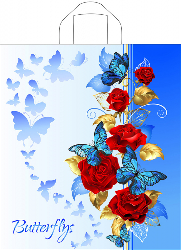 Пакет из ПНД "Синие бабочки" с петлевой ручкой, размеры: 420*380*0,037. Красочные потребительские пакеты с готовым дизайном пользуются спросом в различных сетевых магазинах и розничных точках продаж. Их вы можете встретить, как в магазине у дома, так и в крупном торговом центре, а также в дорогом бутике по продаже элитной мужской или женской одежды. В одной упаковке 50 пакетов