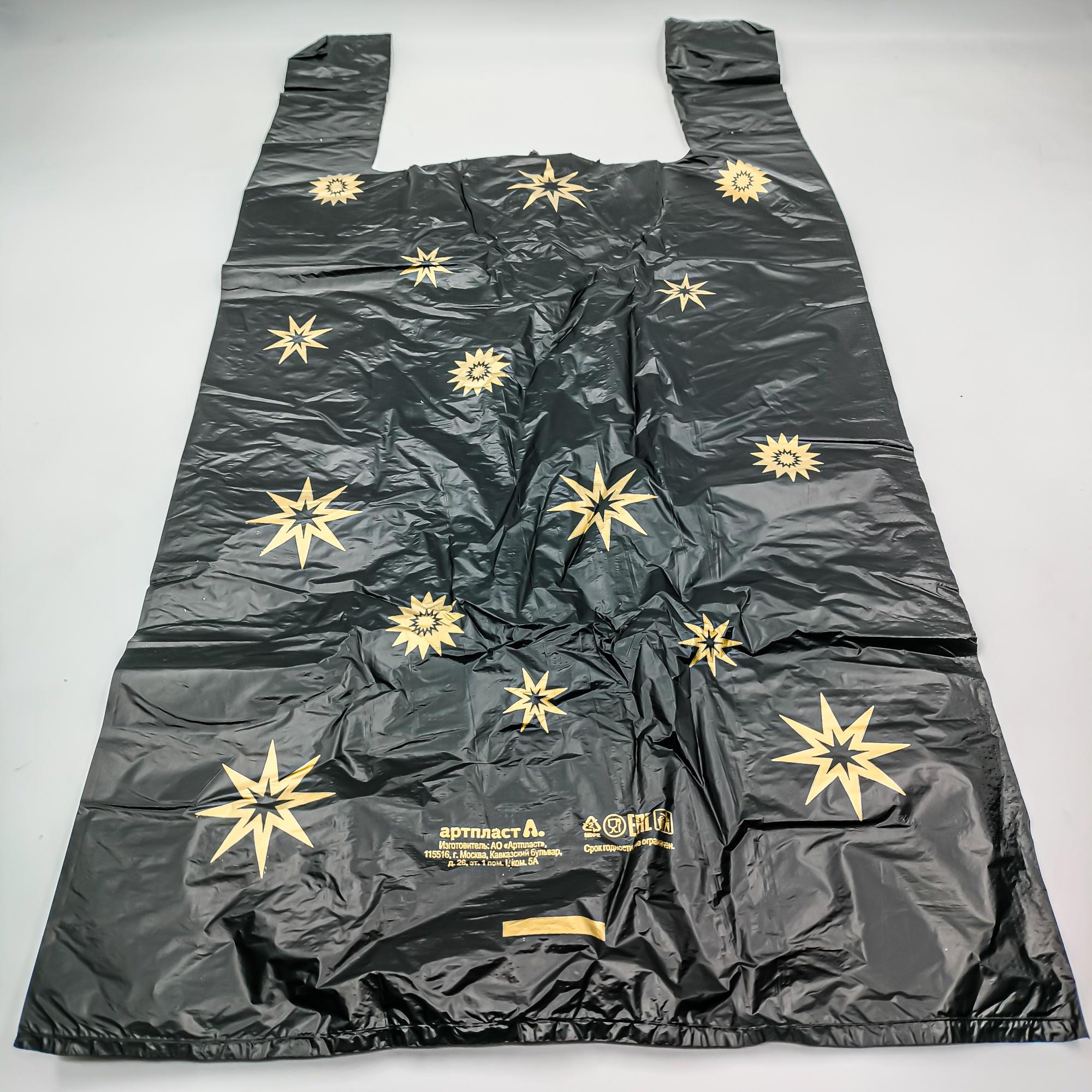 Майка черная с рисунком "Звезды", размеры 30+16*60, толщина 14 мкм, в упаковке 50 маек. Майка выполнена из материала, безопасного для здоровья. Подходит для хранения и фасовки продуктов, непродовольственных товаров. Такие майки используются в быту, в торговле, на производстве. Пакет прочный на растяжение, подходит для многократного использования