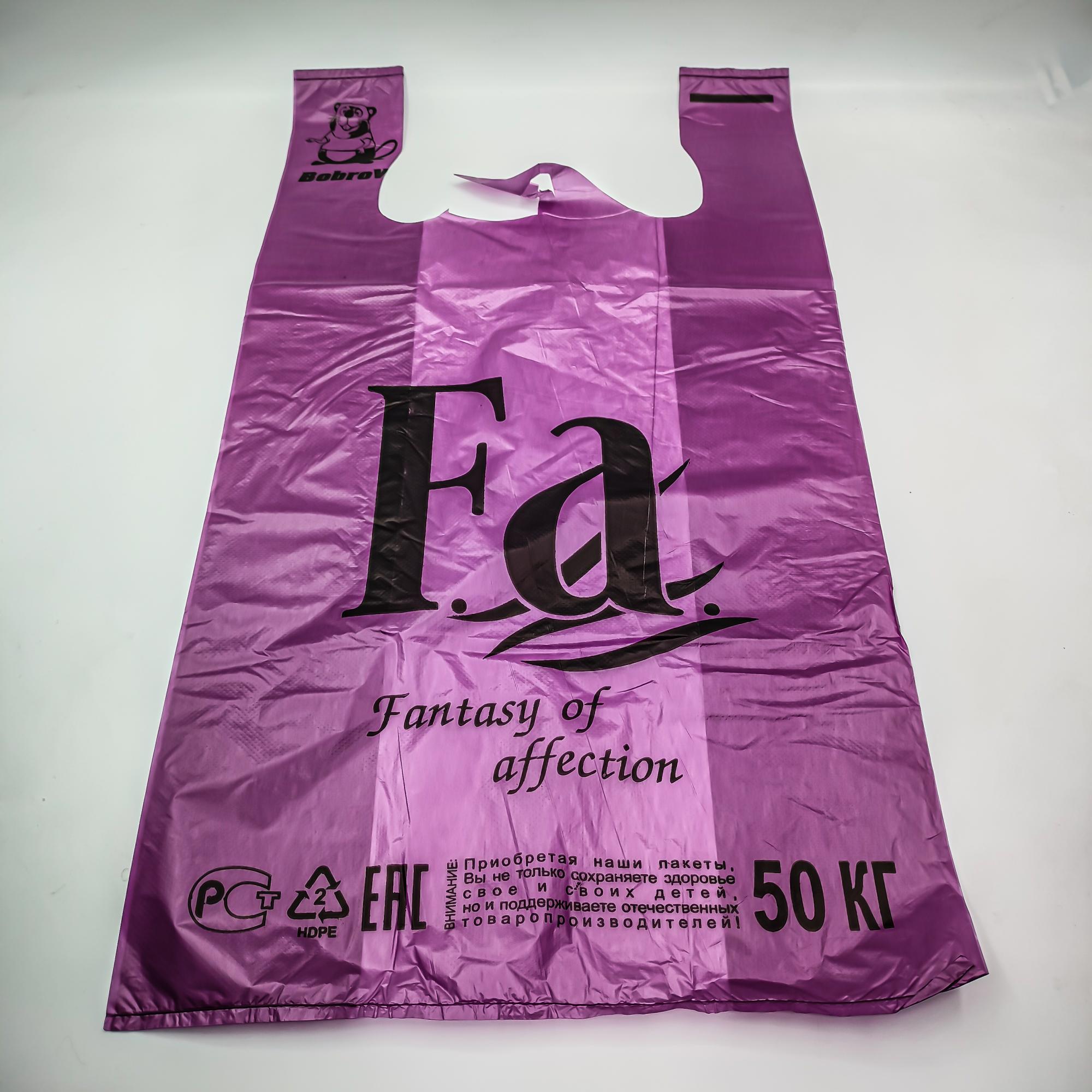 Майка фиолетовая с печатью "Фа", размеры 30+16*55, толщина 25 мкм, в упаковке 100 маек. Майка выполнена из материала, безопасного для здоровья. Подходит для хранения и фасовки продуктов, непродовольственных товаров. Такие майки используются в быту, в торговле, на производстве. Пакет прочный на растяжение, подходит для многократного использования
