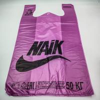Майка фиолетовая с печатью "Найк", размеры 30+16*55, толщина 25 мкм, в упаковке 100 маек. Майка выполнена из материала, безопасного для здоровья. Подходит для хранения и фасовки продуктов, непродовольственных товаров. Такие майки используются в быту, в торговле, на производстве. Пакет прочный на растяжение, подходит для многократного использования